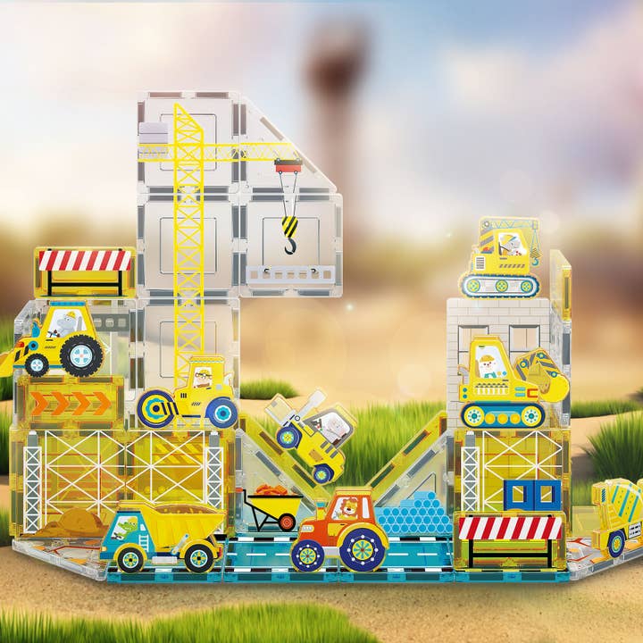 Our 45-piece magnet tile set includes 17 square pieces with construction designs, 5 triangular builder-themed units, 2 colored triangles, 4 rectangular motif slabs, 2 clear squares, 7 colored square parts, and 8 construction vehicle machinery character action figures, in addition to the printed theme. Snap these magnetic parts together to create and craft stories through your masterpieces.